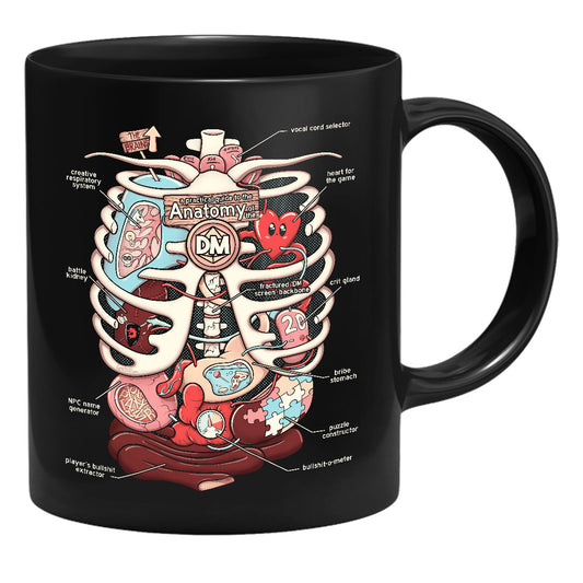 Jos taas olet se, joka ohjaa tarinaa ja pitää pelaajat varpaillaan, Dungeon Masterin anatomiaa esittävä design osuu suoraan kohteeseen. Tämä yksityiskohtainen ja humoristinen kuvaus näyttää, mistä pelinjohtaja oikeasti koostuu – kärsivällisyydestä, juonittelusta ja loputtomasta luovuudesta.