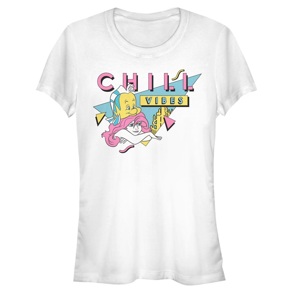 Naisten Pieni Merenneito -T-paita, jonka kuvassa on Ariel ja Pärsky, sekä teksti: "Chill Vibes". Kaikki verkkokauppamme naisten lyhythihaiset Pieni merenneito -T-paidat ovat 100% virallisia ja aitoja fanituotteita.