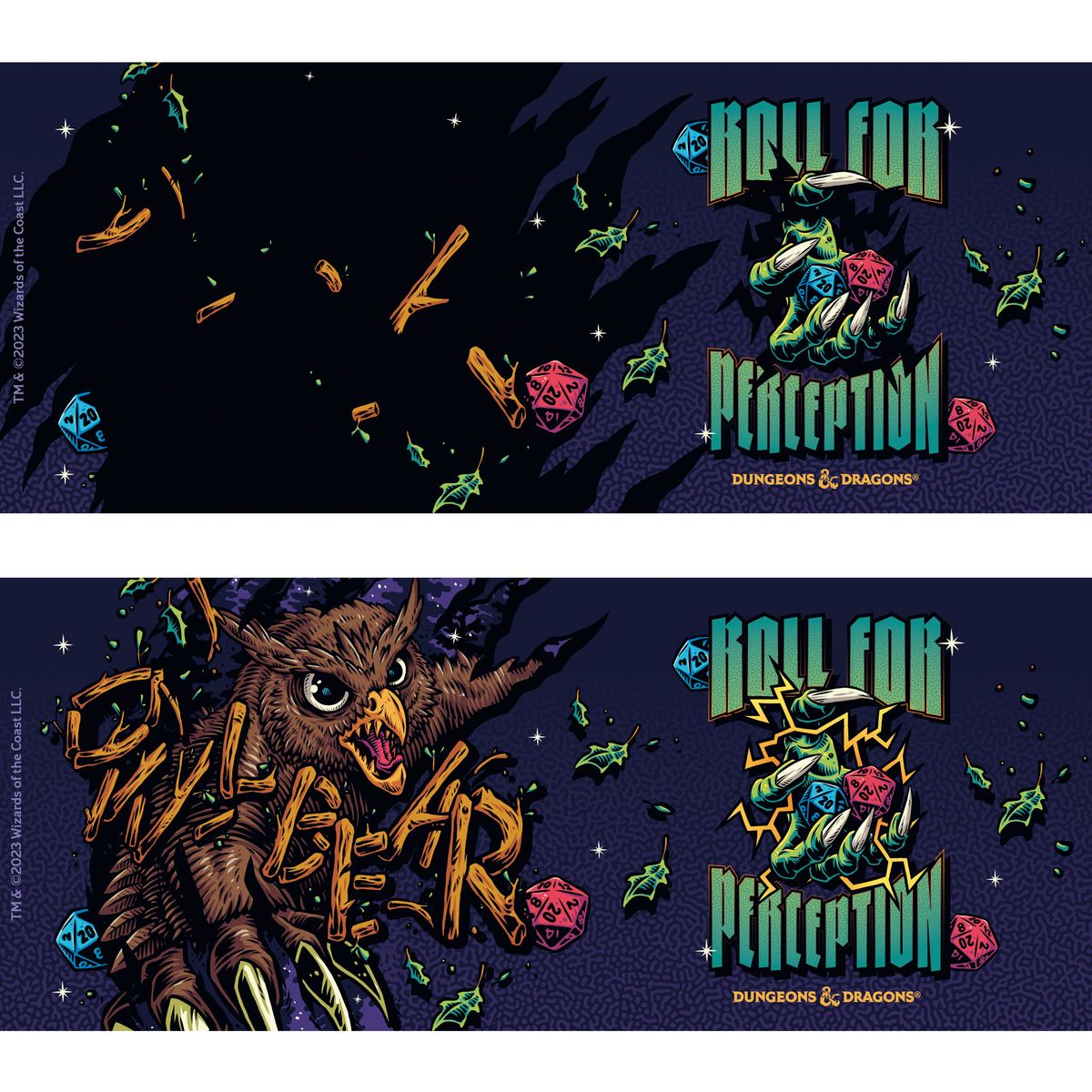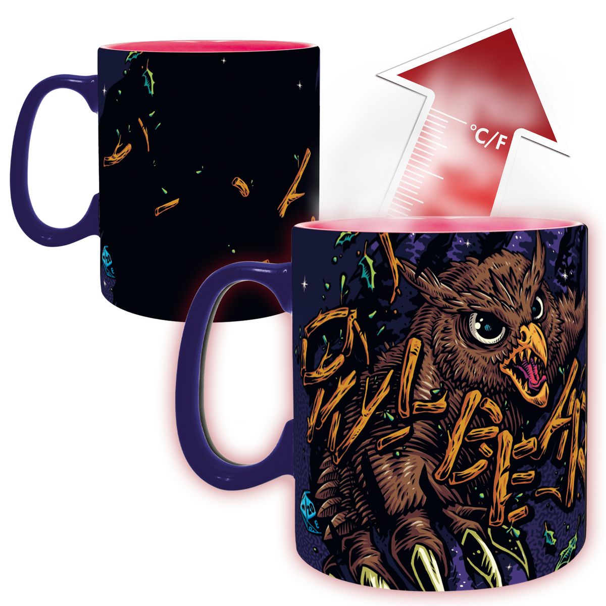 Lämpöön reagoiva, isokokoinen Dungeons & Dragons -muki. Kun muki on kylmä, kuvassa on käsi ja kaksi W20-noppaa. Kun mukiin kaataa kuumaa nestettä, ilmestyy pöllö. D & D -mukit ovat täydellinen valinta fantasiapelien hektisiin hetkiin.