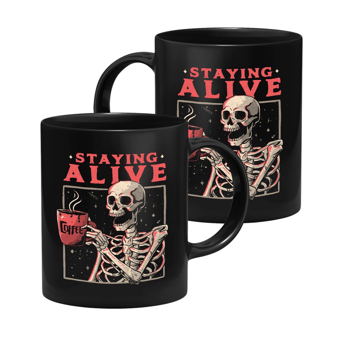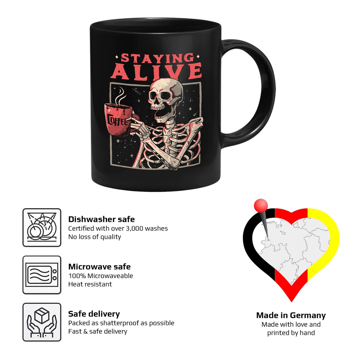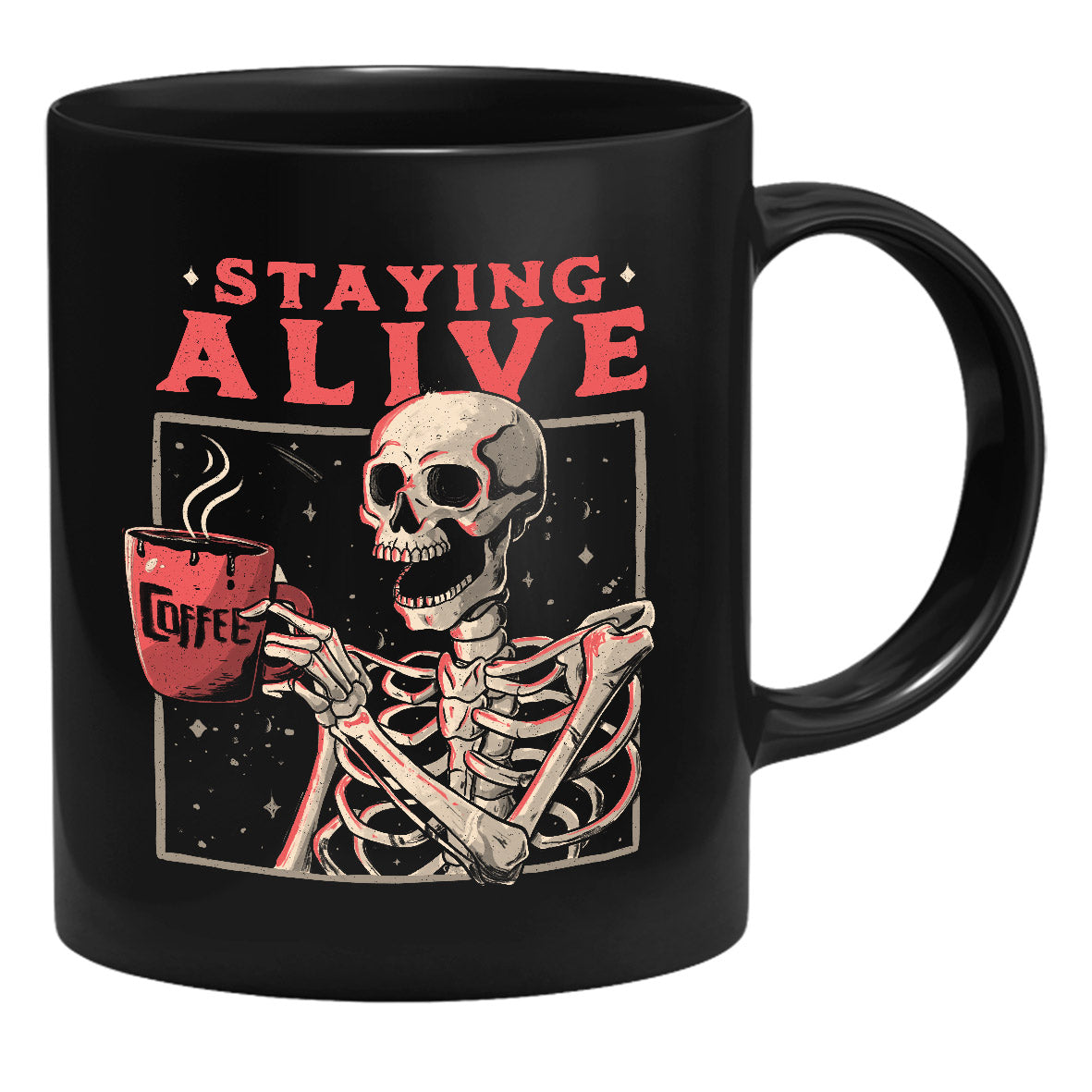 Eduardo Ely -muki, jonka kuvassa on luuranko kahvikupin kanssa ja teksti “Staying Alive”.