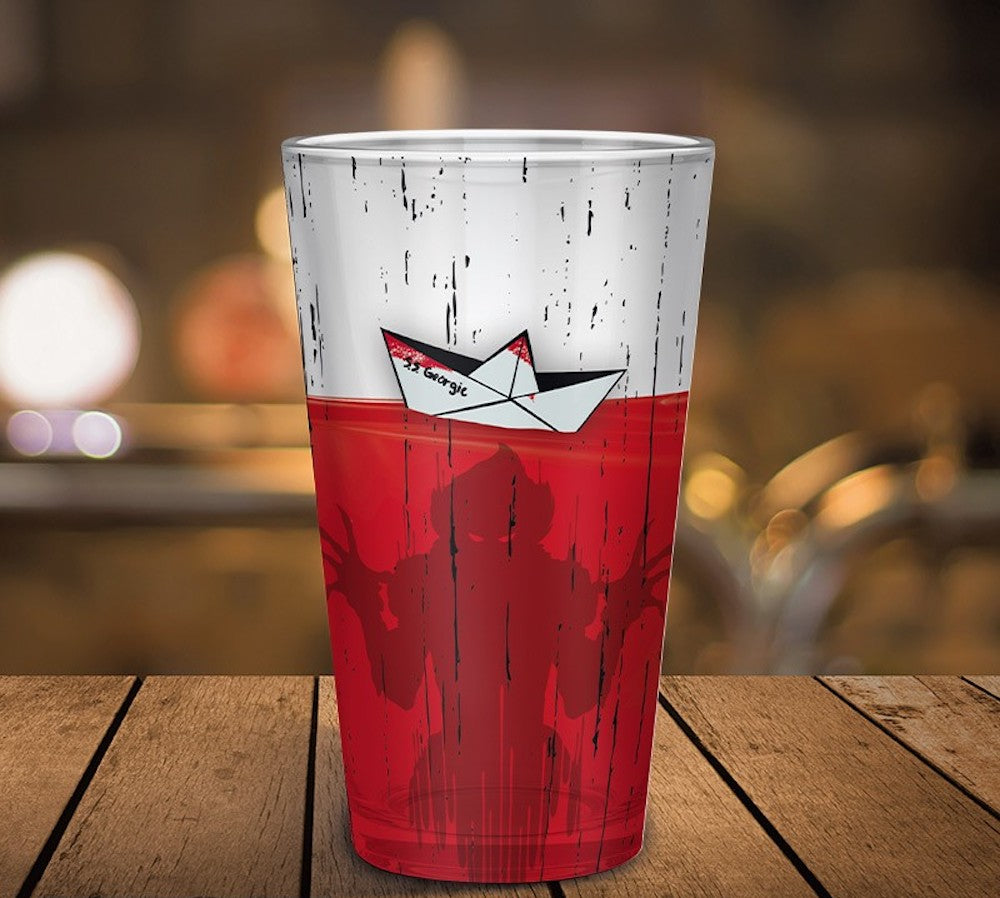 XXL-kokoinen It-juomalasi, jossa Pennywise, Georgien paperivene ja teksti "Time to Float".