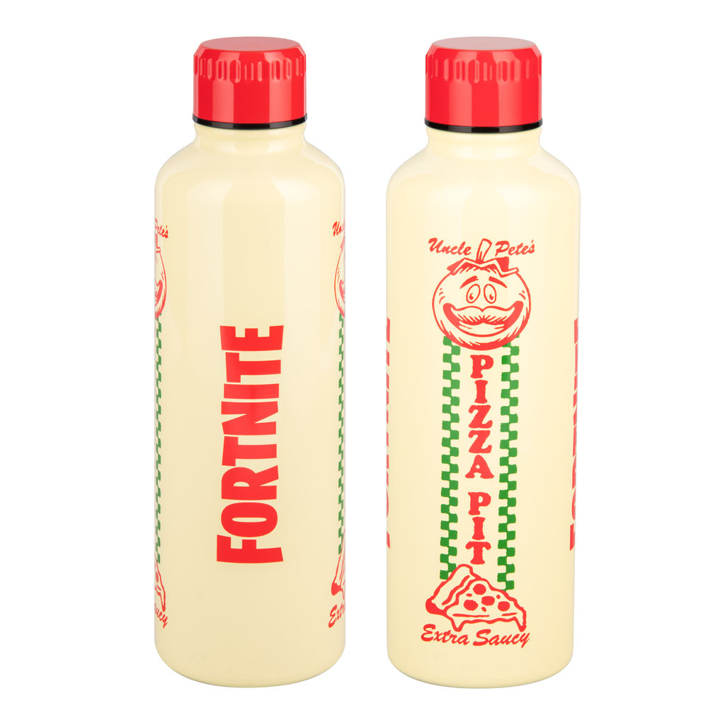 Fortnite-juomapulloa koristavat sekä Fortnite-logo että Uncle Pete's Pizza Pitin tunnus – suoraan pelimaailmasta tutut yksityiskohdat tekevät siitä täydellisen janon sammuttajan ahkeralle pelaajalle.