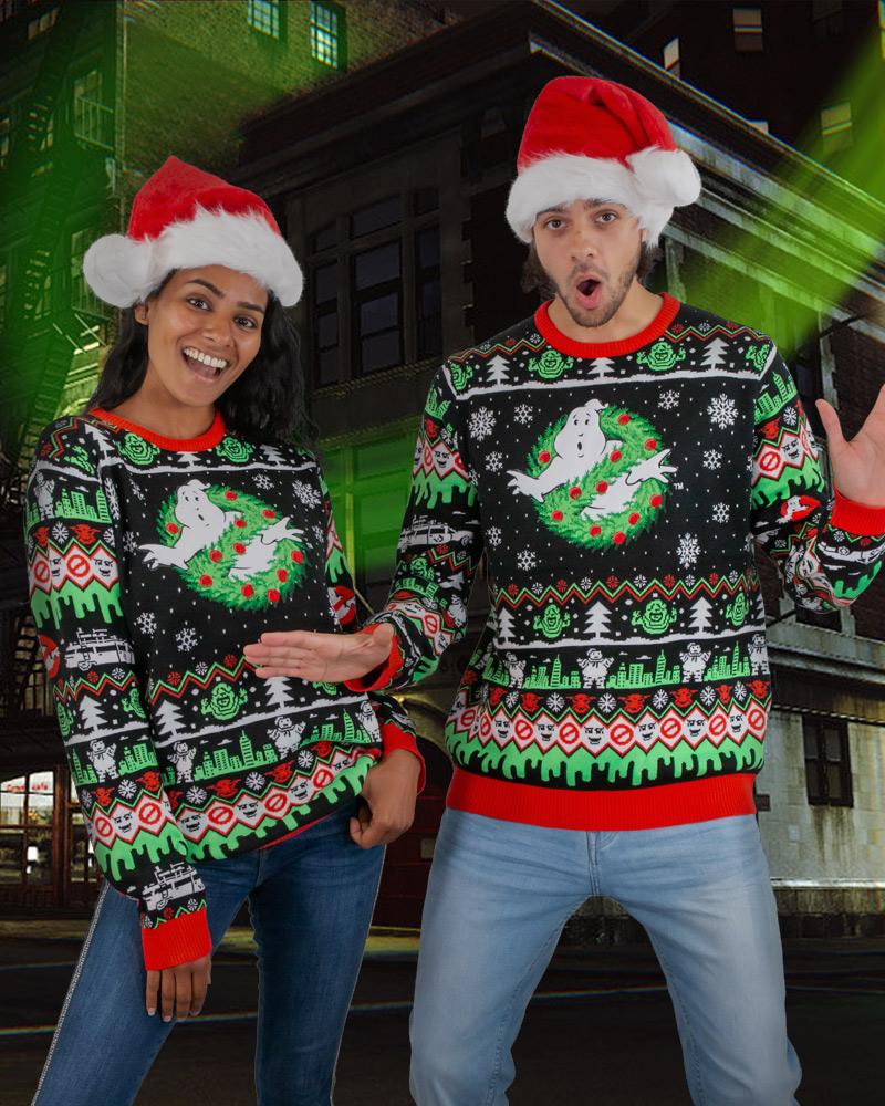Ghostbusters-jouluneule, jossa on edessä jouluhenkinen Ghostbusters-logo. Haamujengin faneilla on vain yksi varteen otettava vaatevaihtoehto jouluksi ... Ghostbusters -jouluneuleet!