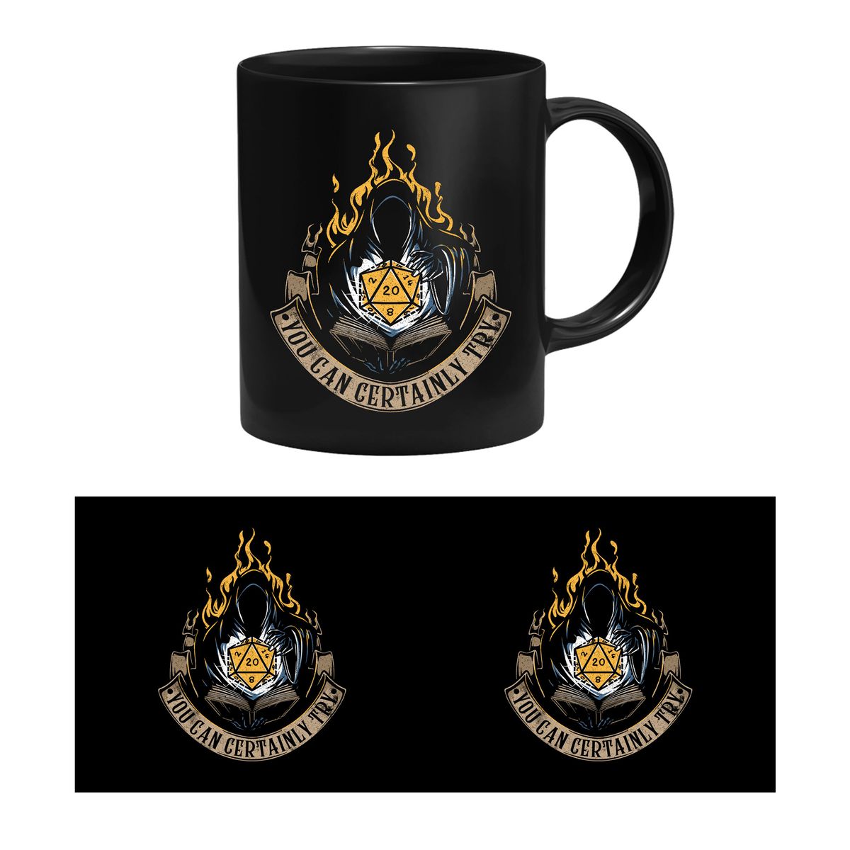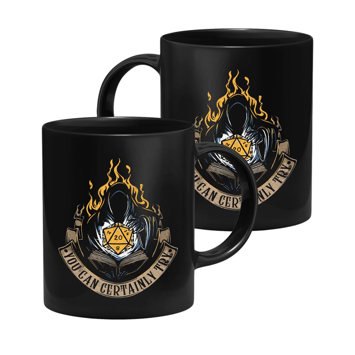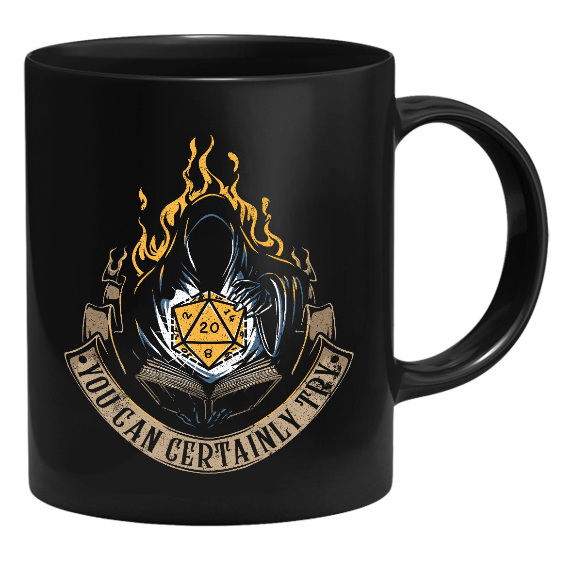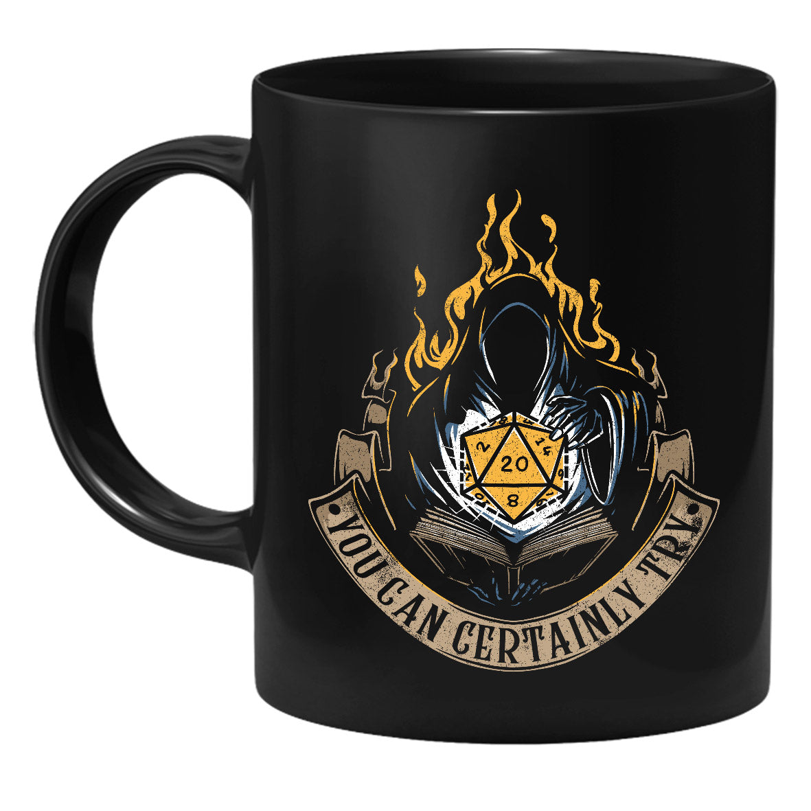 GlassStaff-muki, jonka kuvassa on kaapuun pukeutunut mystinen hahmo D20-nopan ympärillä ja teksti “You Can Certainly Try”. Dungeons & Dragonsin inspiroimat GlassStaff-mukit löydät yvolven valikoimasta.
