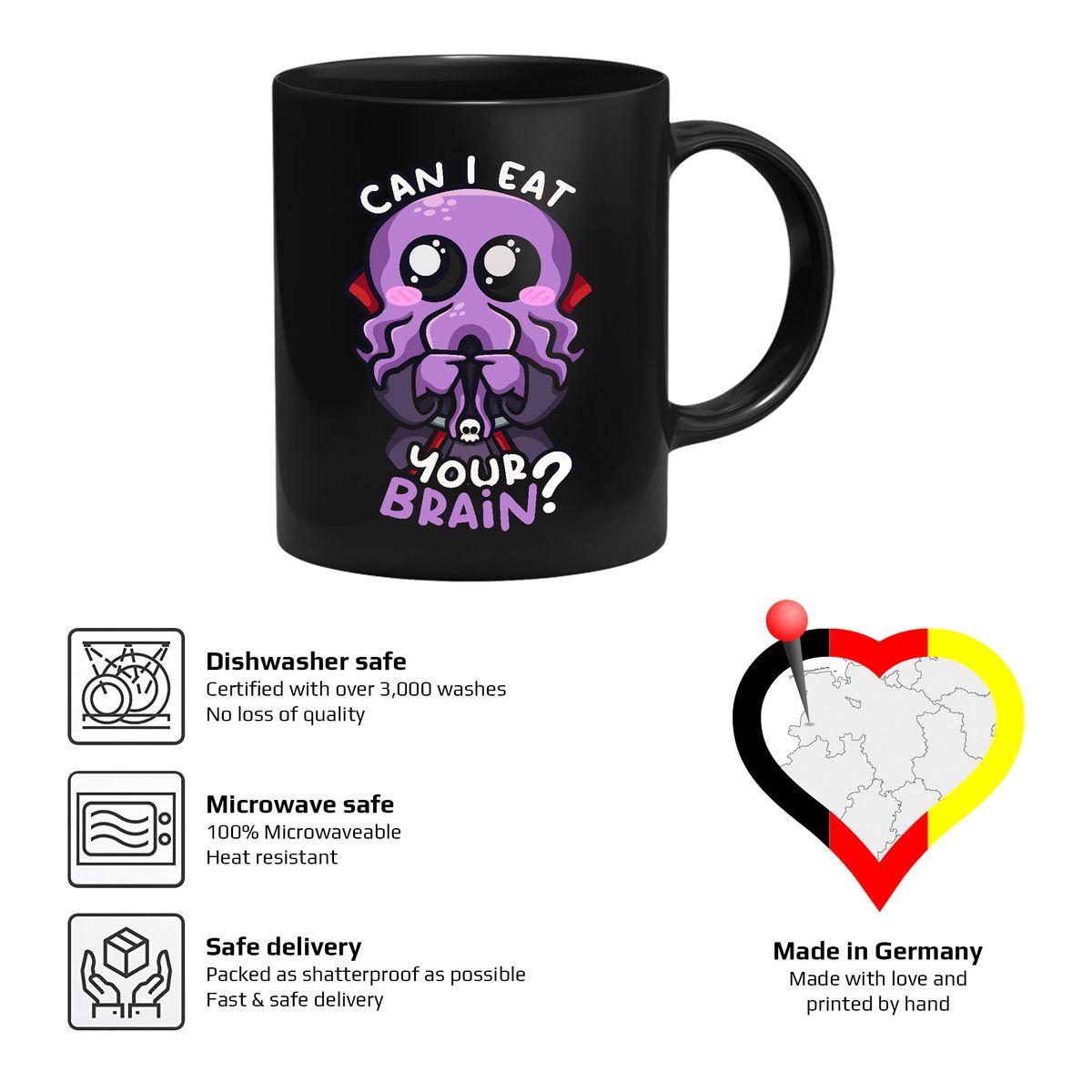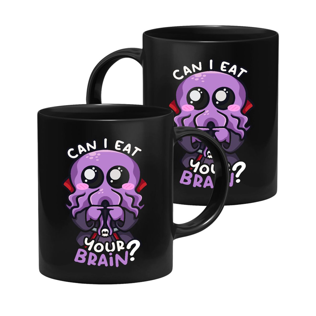GlassStaff-muki, jonka kuvassa on suloinen mindflayer ja kysymys “Can I Eat Your Brain?”. Dungeons & Dragonsin inspiroimat GlassStaff-mukit löydät yvolven valikoimasta.