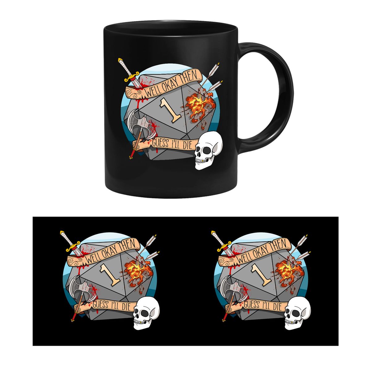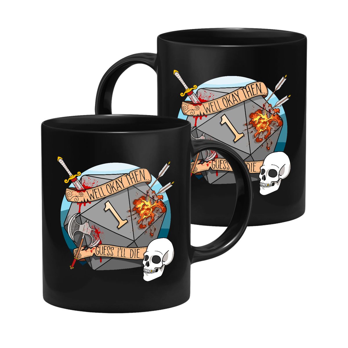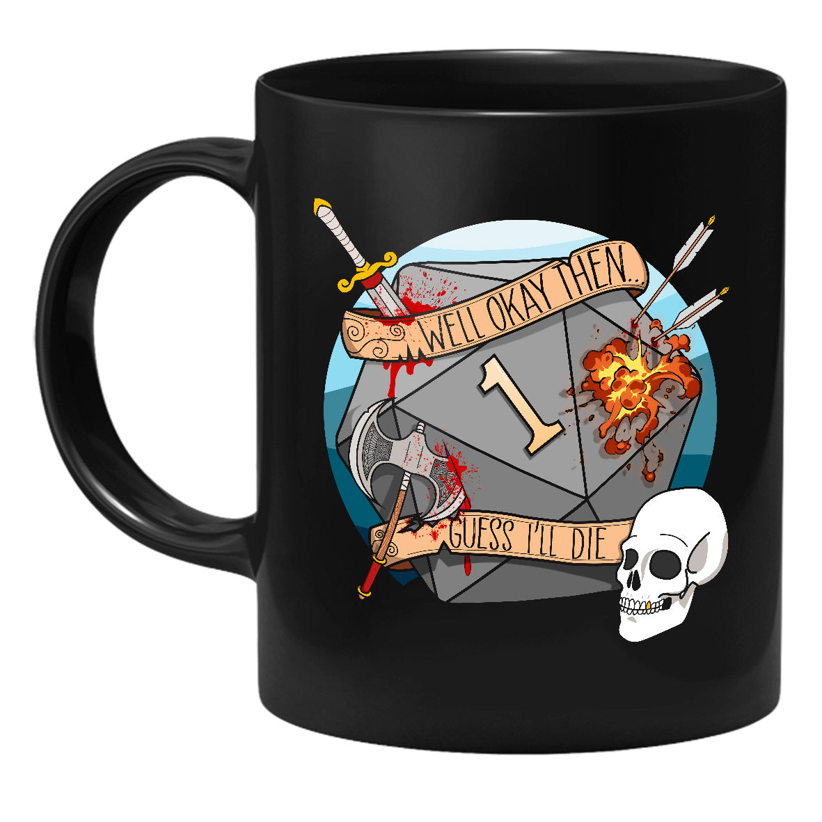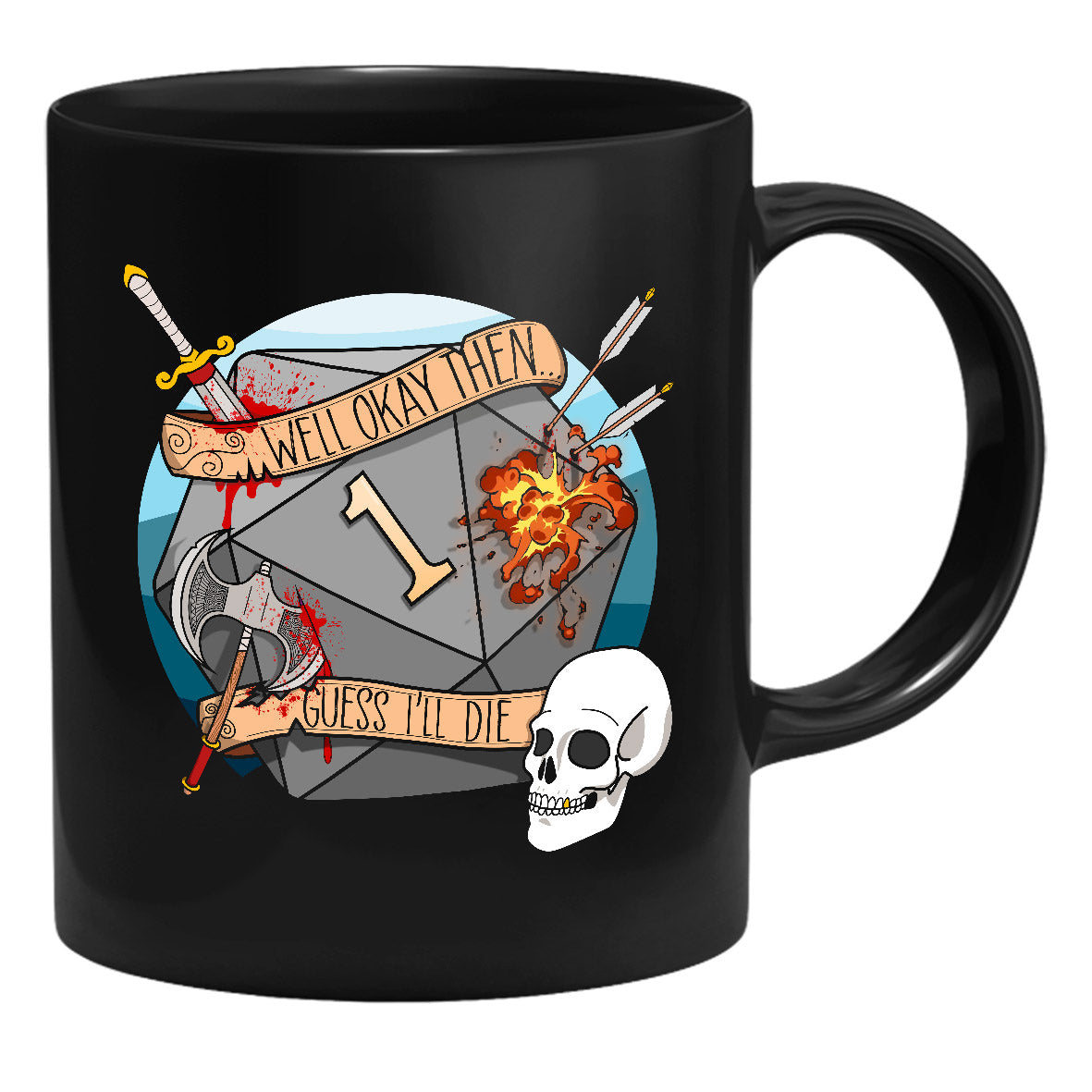 GlassStaff-muki, jonka kuvassa on D20-noppa ja teksti "“Well Okey Then... Guess I'll Die”. Dungeons & Dragonsin inspiroimat GlassStaff-mukit löydät yvolven valikoimasta.