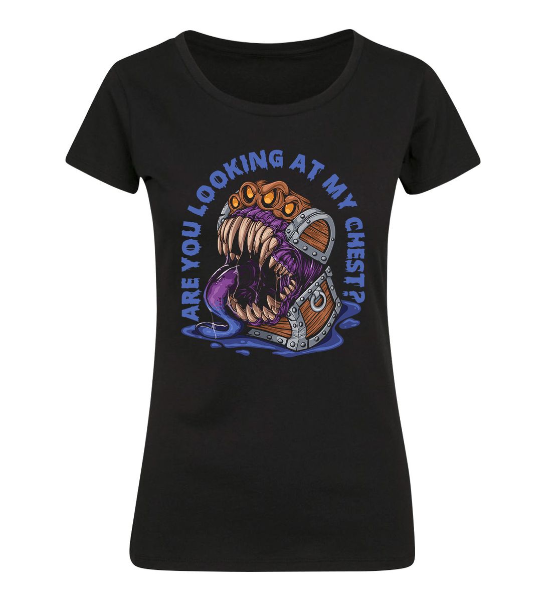 Naisten GlassStaff-paita, jonka kuvassa on mimic ja teksti “Are You Looking At My Chest?”. Dungeons & Dragonsin inspiroimat GlassStaff T-paidat löydät yvolven valikoimasta.
