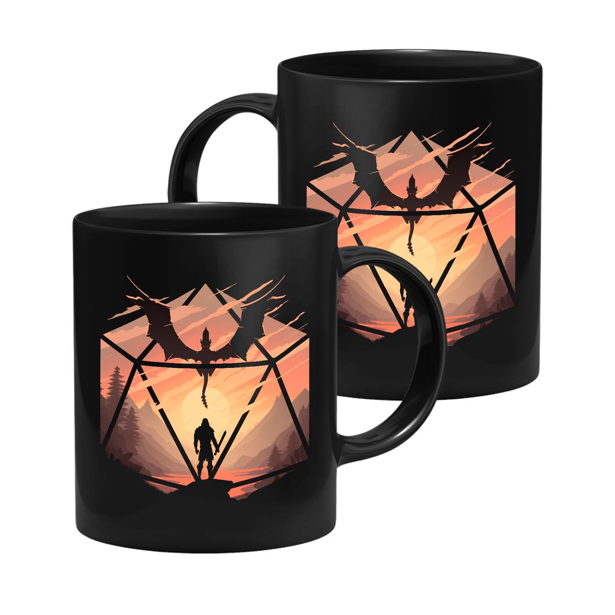 GlassStaff-muki, jonka kuvassa on siluetti seikkailijasta ja lohikäärmeestä D20-nopan sisällä. Dungeons & Dragonsin inspiroimat GlassStaff-mukit löydät yvolven valikoimasta.