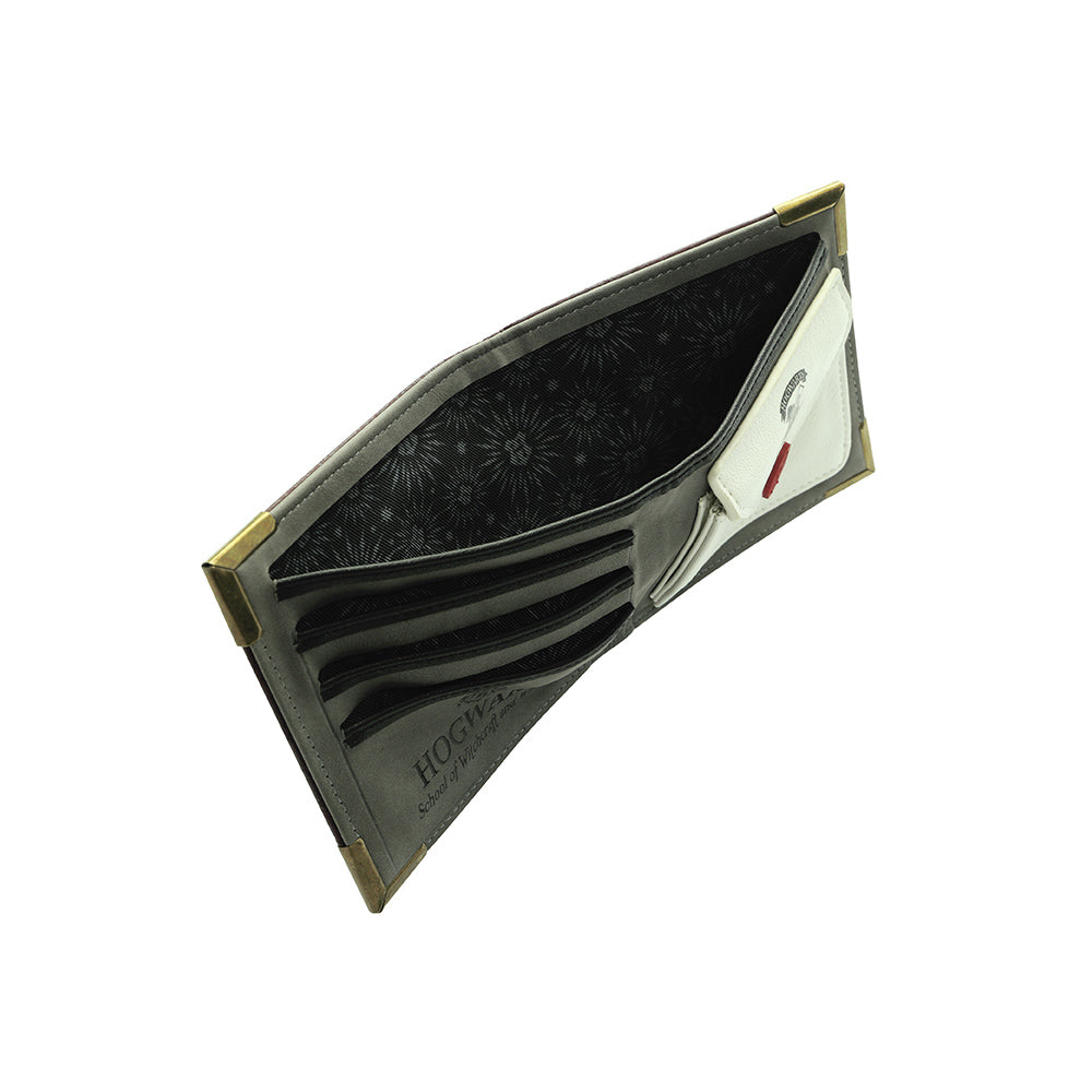 Harry Potter -lompakko, jossa on koristeena Hogwarts-vaakuna. Tylypahka-lompsa on Potter-fanin valinta eurojen säilyttämiseen.