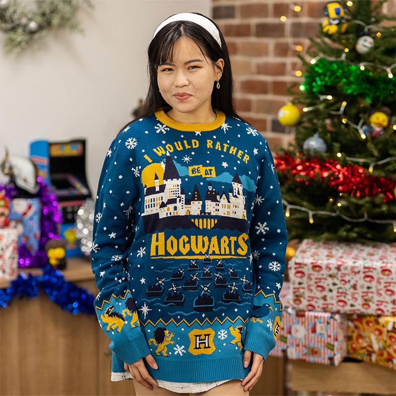 Harry Potter -jouluneule, jossa on edessä Tylypahkan kuva ja teksti "I Would Rather Be at the Hogwarts". Potter-faneilla on vain yksi varteen otettava vaatevaihtoehto jouluksi ... Harry Potter -jouluneuleet!