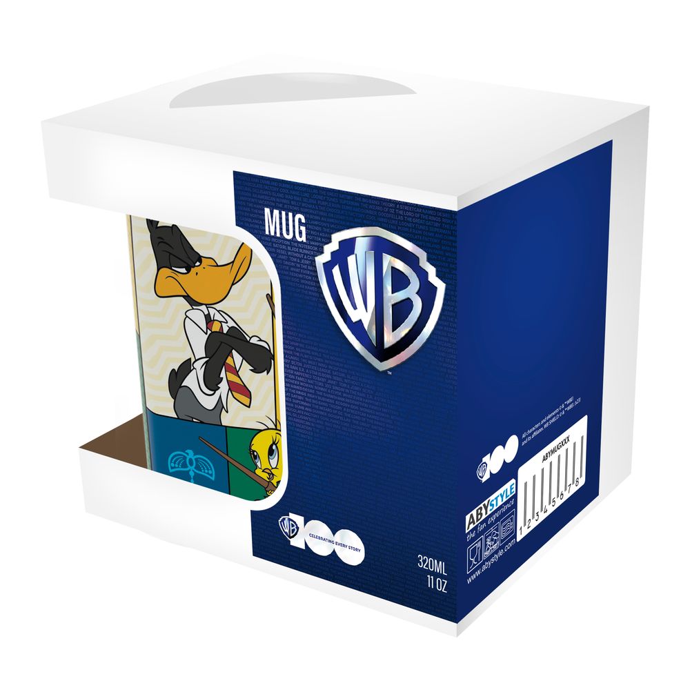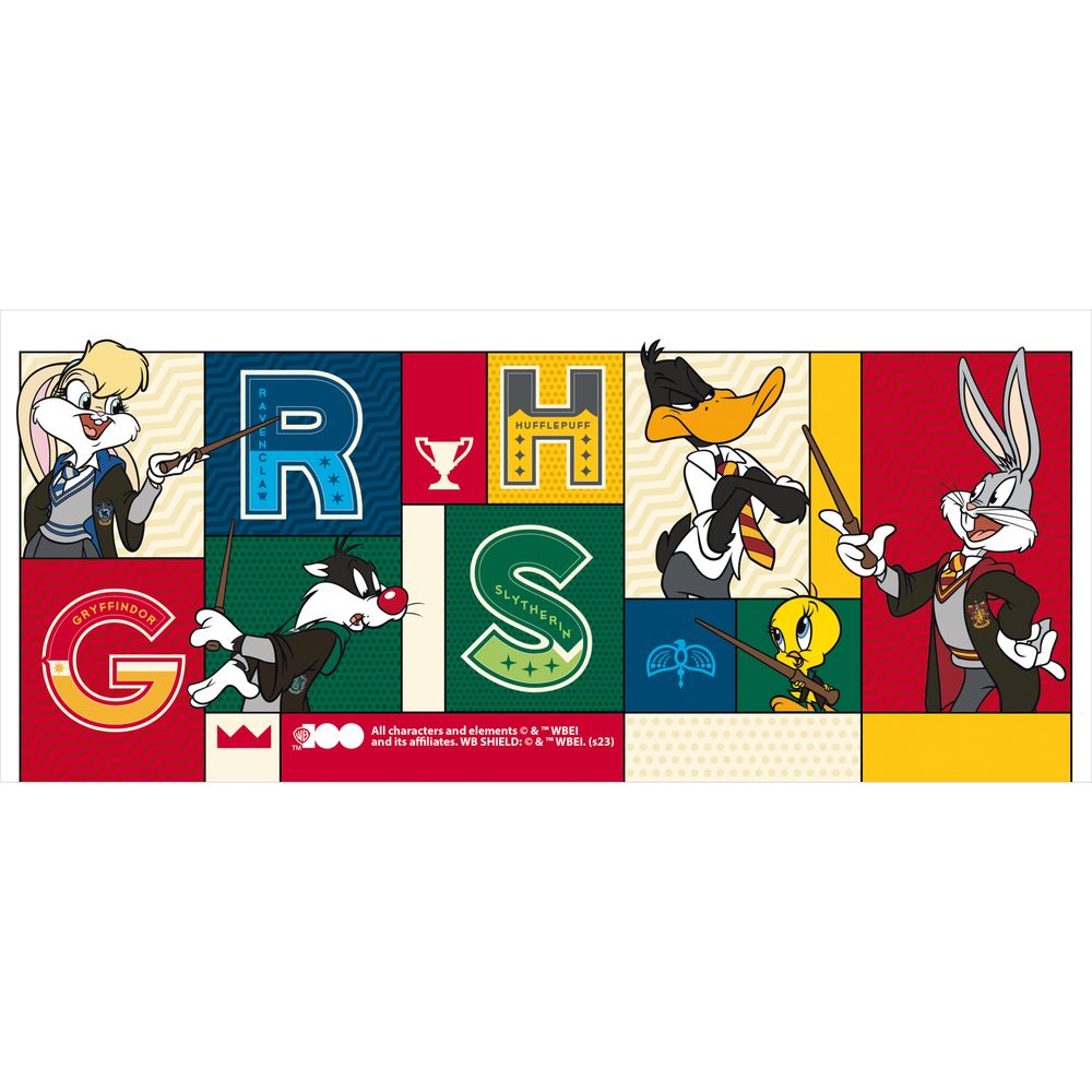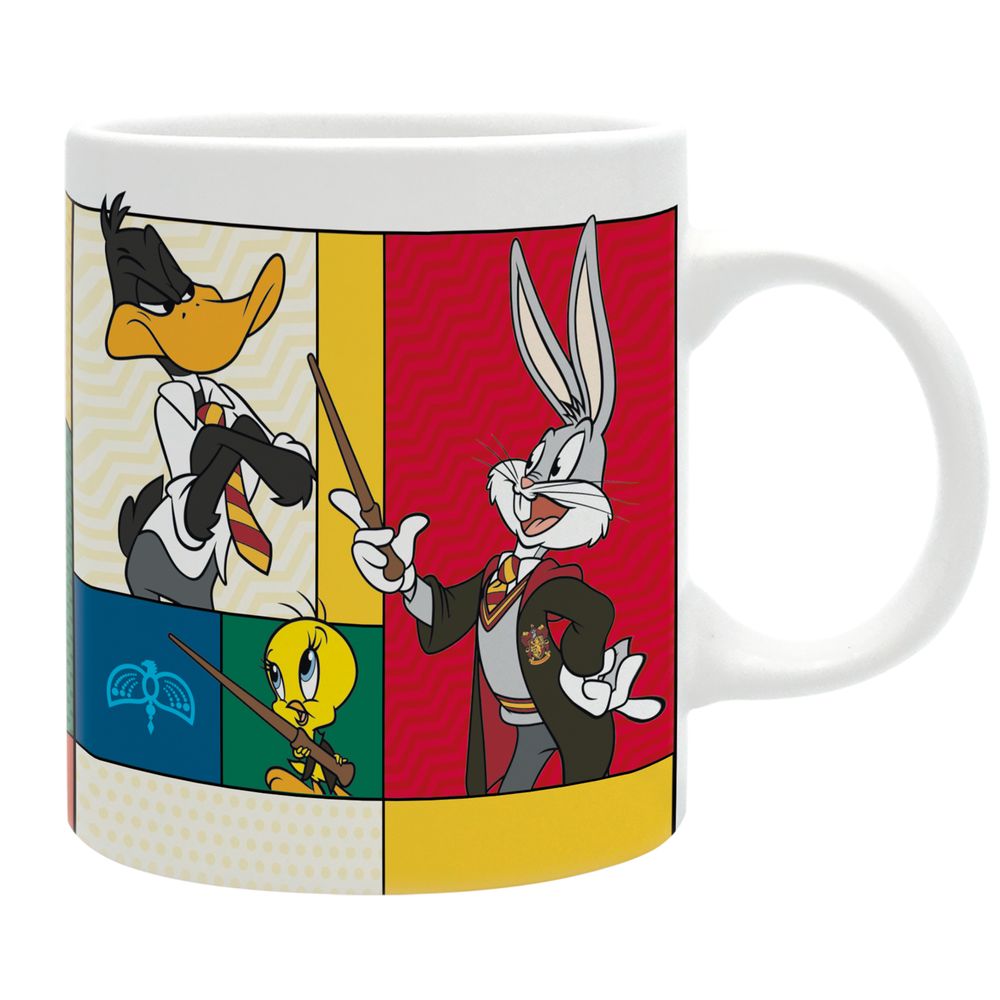 Harry Potter meets Looney Tunes! Värikäs Looney Tunes -kahvimuki, jossa on Lola, Sylvesteri, Tipi, Väiski Vemmelsääri ja Repe Sorsa pukeutuneina Tylypahkan tupien asuihin.