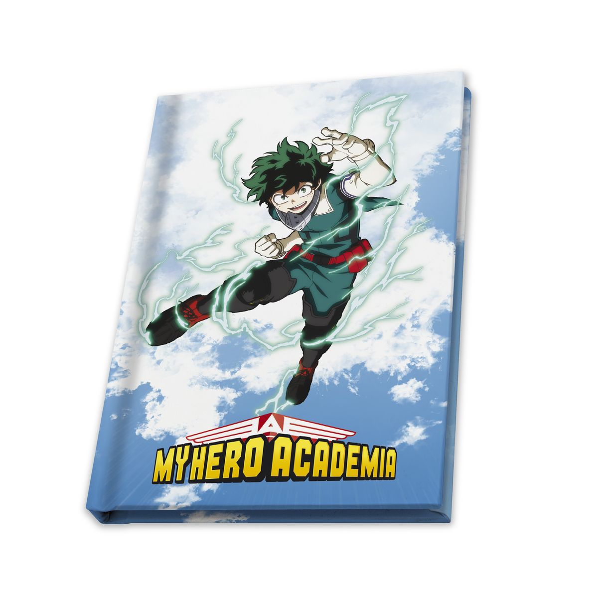 My Hero Academia -setti koostuu lasista, muistikirjasta ja pinssistä, jotka on koristeltu Dekun kuvalla. Anime-fanin unelmalahja.