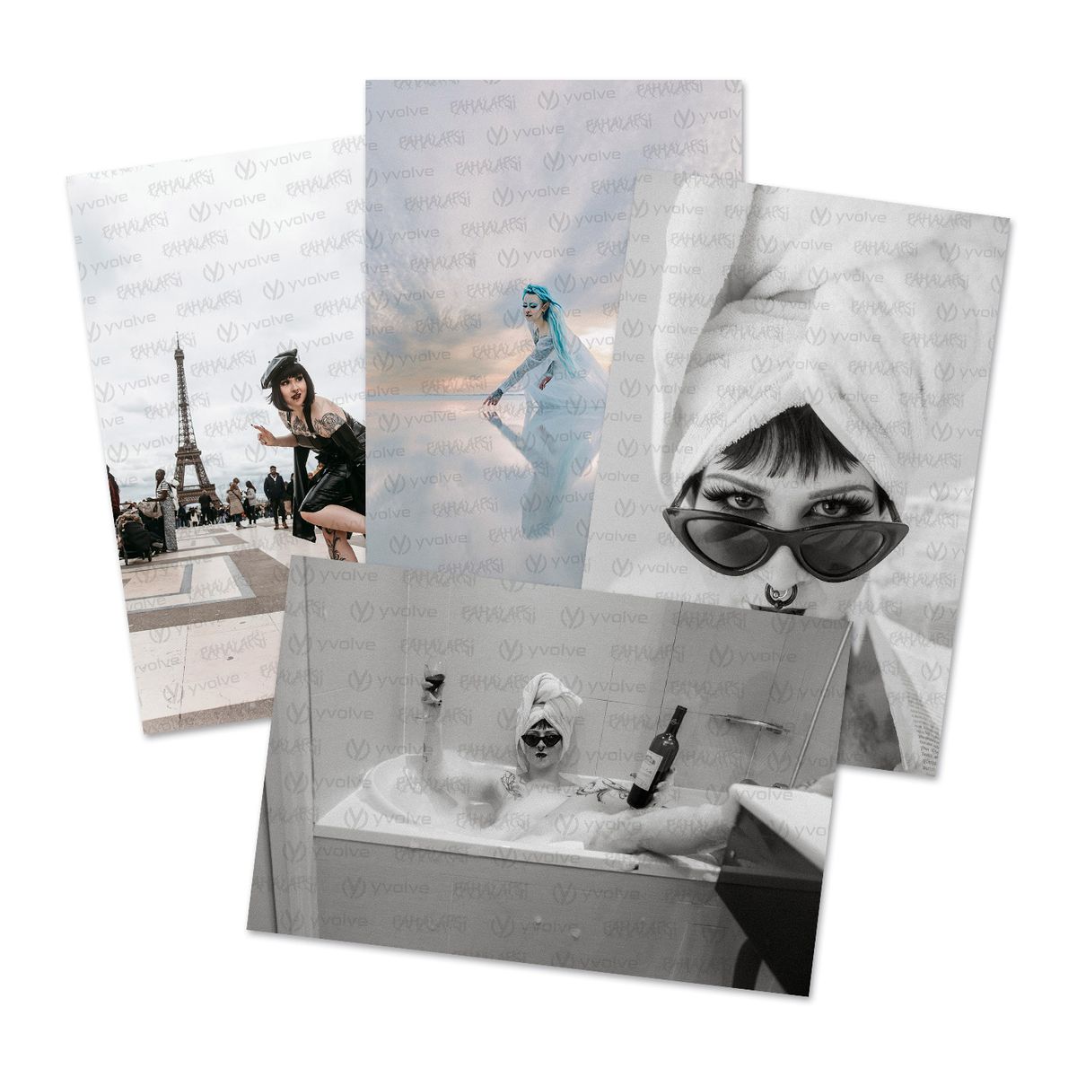 Upeita, laadukkaita art print -julisteita neljän (4) kappaleen setissä. Kuvissa Pahalapsi jääprinsessana, kylvyssä, pariisittarena ja kylvyssä viinipullon ja -lasin kera.