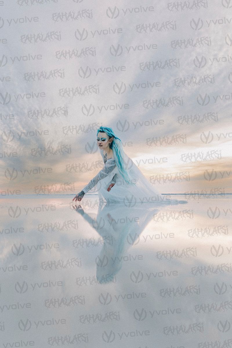“Se, että saatiin taltioitua juuri tämä hetki Joensuun Kuhasalossa, on jo itsessään melkein maagista. Sininen jääprinsessa-meikki, upea valkoinen hääpuku, auringonlasku ja järven ahtojäälle noussut ohut vesikerros, joka loi kuin peilin alleen… ja siinä mie polvillaan, heijastuksen kanssa kaksin. Jos haluat seinällesi ripauksen susirajan kauneutta ja taianomaista prinsessafiilistä, tää on just se juliste.”