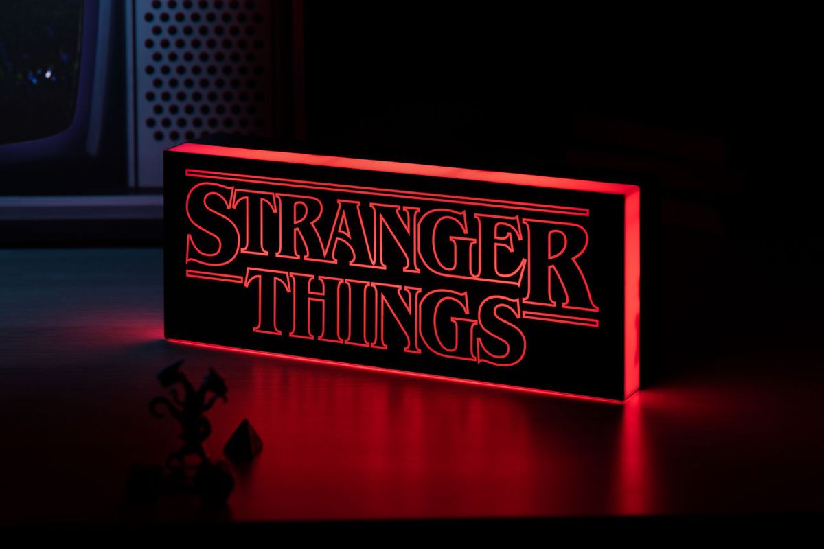Stranger Things -logon näköinen pöytälamppu. Stranger Things -valaisimet tuovat mystistä tunnelmaa sarjojen tai leffojen katseluun.