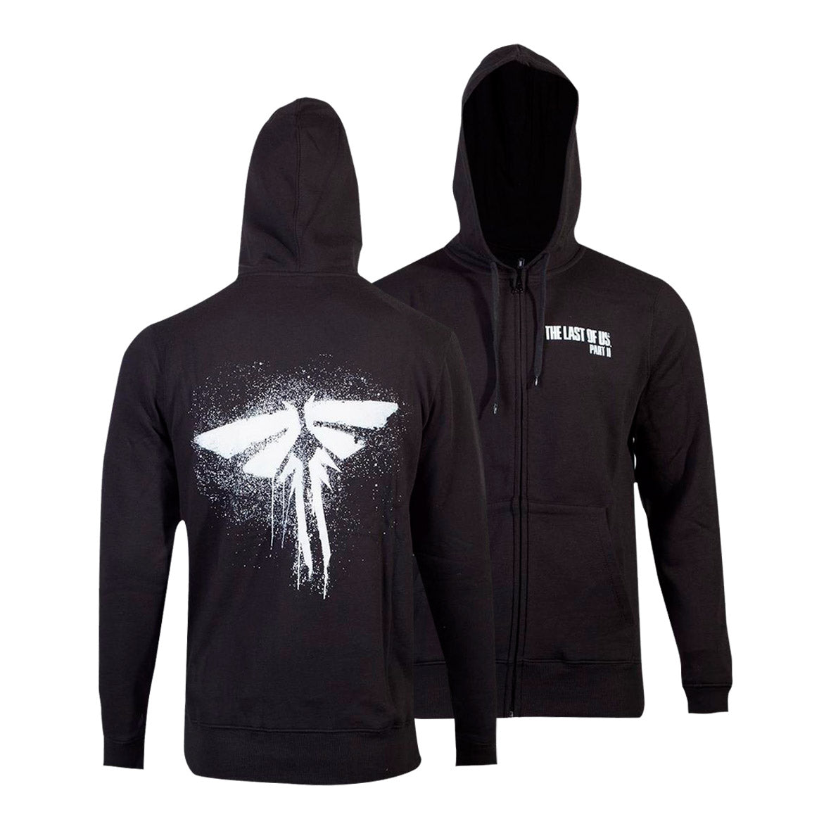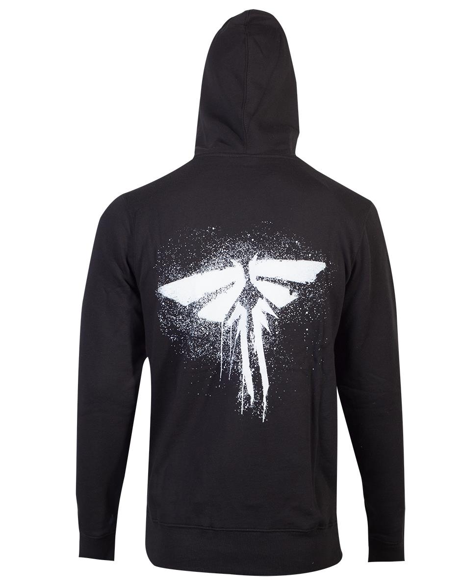 Musta The Last of Us -vetoketjuhuppari, jossa on edessä The Last of Us -logo ja takana Firefly-logo. Kun pelin ystävät tarvitsevat lämmintä päälle pantavaa, ovat The Last of Us -vetoketjuhupparit varma valinta.