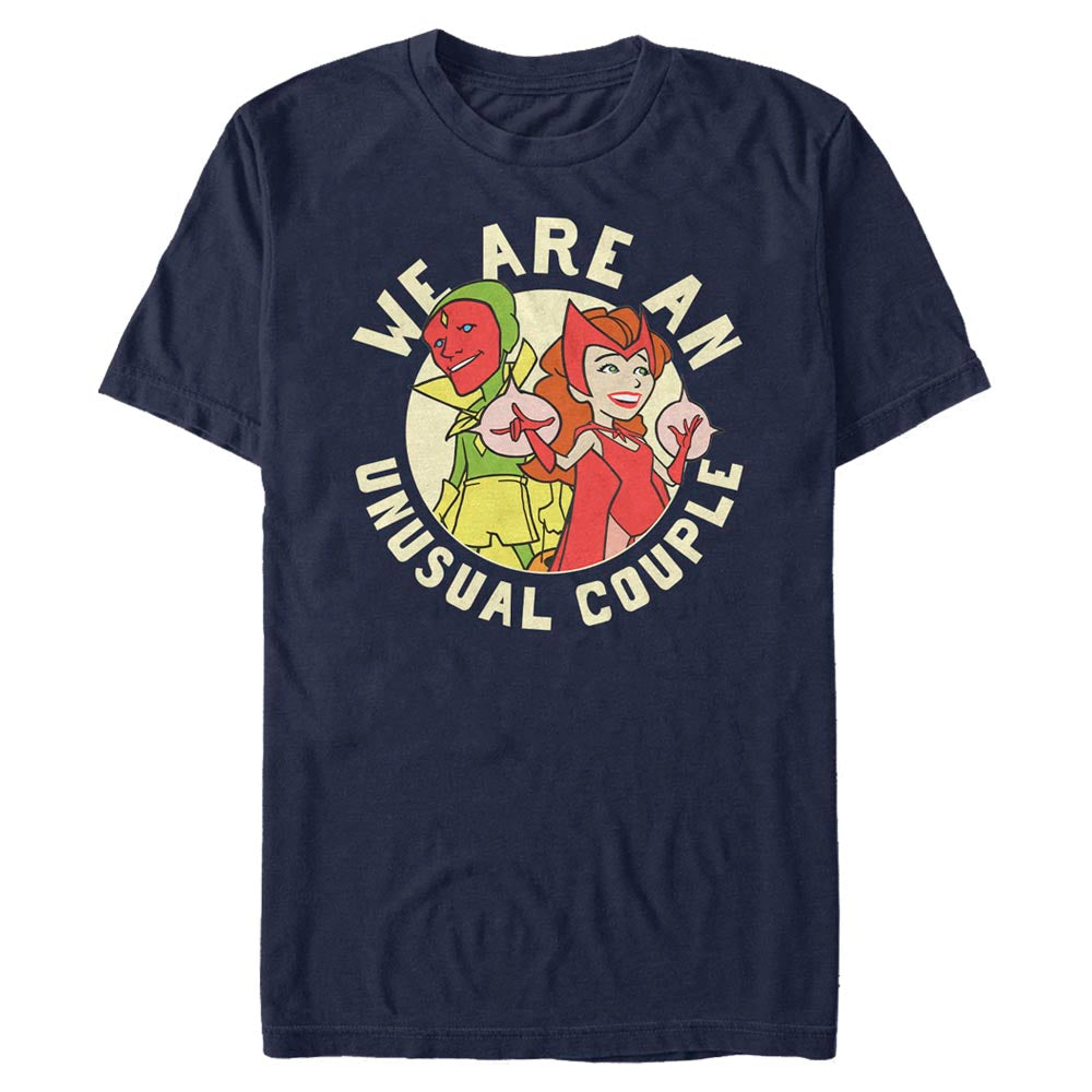 Lyhythihainen WandaVision-T-paita, jossa on Wanda, Vision ja teksti ""We Are An Unusual Couple". Kaikki valikoimamme WandaVision-T-paidat ovat 100% aitoja fanituotteita.