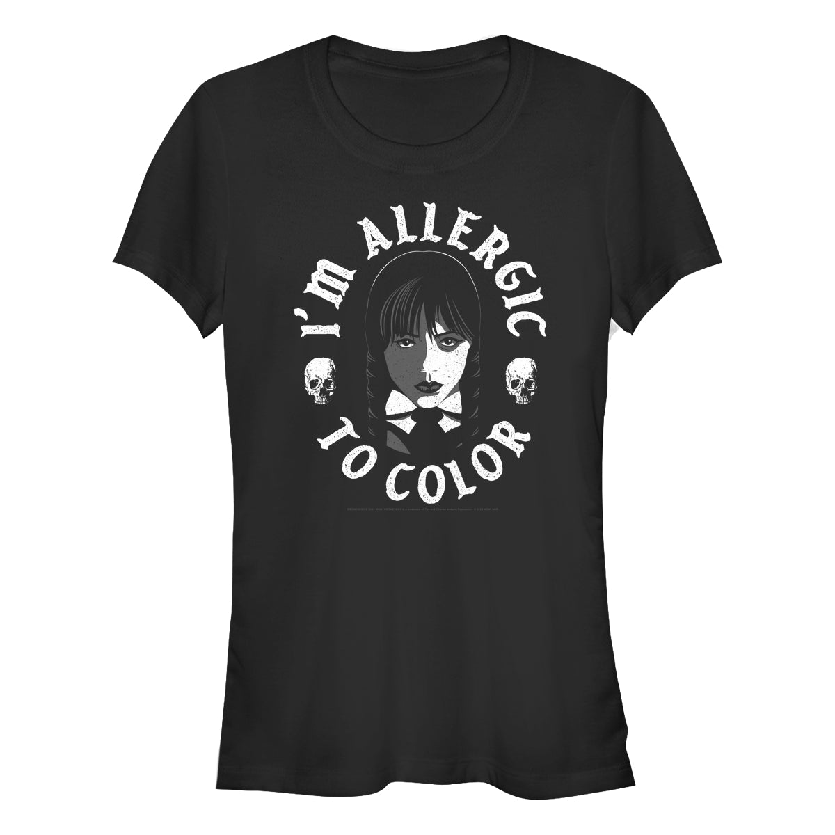 Naisten lyhythihainen Wednesday-paita, jossa on kuva Addamsista ja teksti "I'm Allergic To Color". Jos olet yhtä värikäs tyyppi, kuin Addams, tämä musta naisten Wednesday-T-paita on juuri sinua varten.