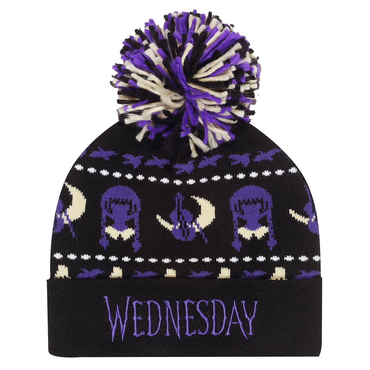 Musta Wednesday-pipo, jossa on Wednesdayn pään kuvia ja logo. Wednesday-pipot ja myssyt ovat täydellinen valinta syksyn viileisiin päiviin tai talven tuiskeisiin - niissä yhdistyy persoonallinen tyyli ja mukavuus.