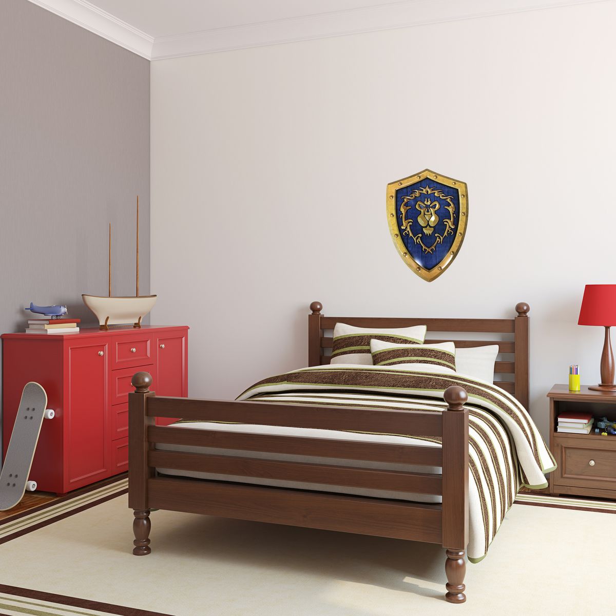 Alliance-vaakunan muotoinen WoW-peltikyltti.